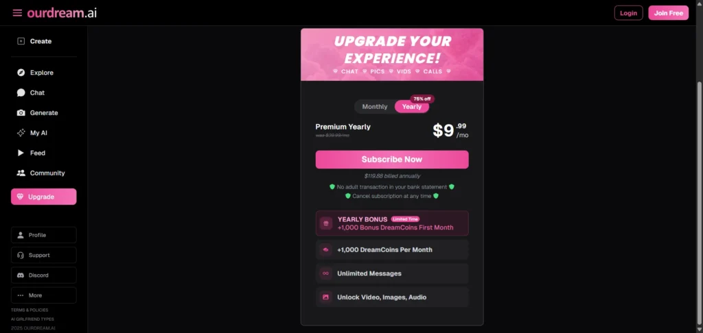 Yearly: It costs $9.99/mo for 1000 DreamCoins if you choose yearly plan.