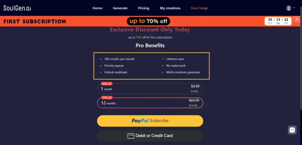 - It offers additional features such as private generations, HD generations, exclusive tags, unlimited search, etc.
