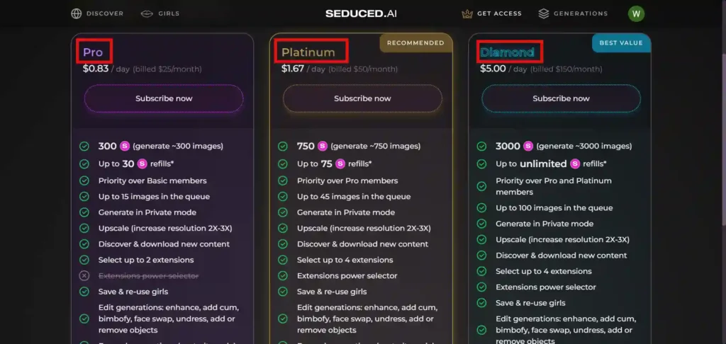 Seduced AI offers 3 pricing plans: