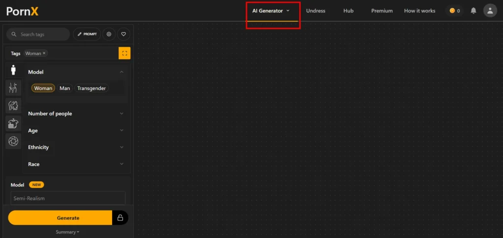 The top menu contains various features. Since we are looking to generate porn, click on the “AI” generator and choose whether to generate porn pictures or videos.