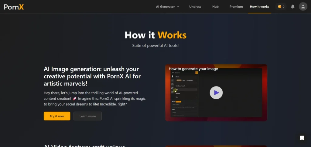 Pornx.ai is an advanced free porn generator with over 2.1 million users. It can generate both AI porn pictures and videos.