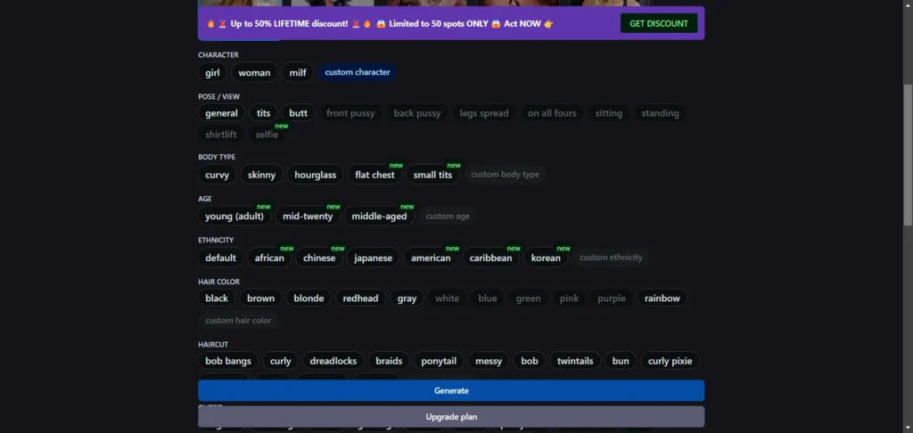 Customization Options: You can customize various aspects of the generated content, including body types, poses, clothing, and more.